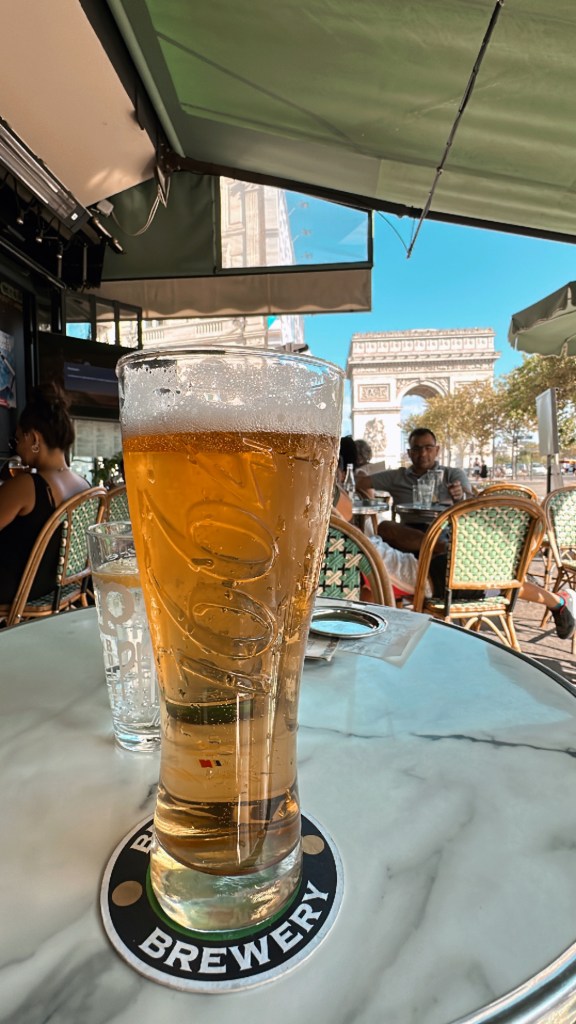 After taking in the panoramic views from the top, I was ready to relax and enjoy a meal. I set off in search of a nearby restaurant where I could sip on my daily beer and savor some lunch while soaking in the view of the arch. Throughout this blog, I’ll be sharing more of the charming spots I found for beer and bites during my time in Paris!